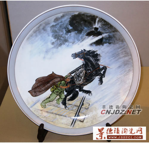 這件瓷盤所繪畫面,正是以烏云密布、風雨交加、即將駛來的火車為背景,描繪了歐陽海舍身攔驚馬這一驚險場面。作品以灰黑色為主調(diào),襯托了主人公不怕犧牲的壯烈之舉與舍己為人的偉大精神。